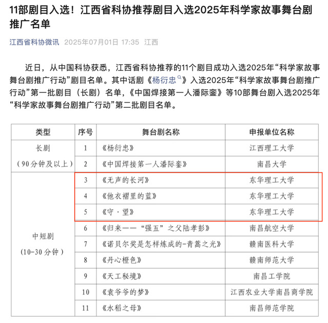 近日,中国科学技术协会公布了2025年“科学家故事舞台剧推广行动”入选剧目名单,由江西省科协推荐的三亿体育(中国)官方网站原创中短剧《无声的长河》《他衣褶里的蓝》《守.望》成功入选。