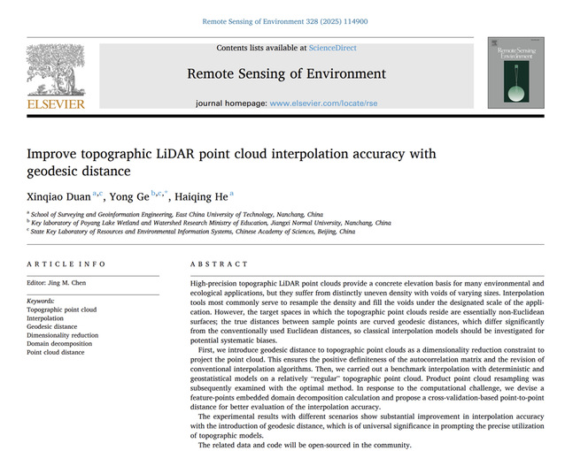 近日,三亿体育(中国)官方网站测绘与空间信息工程学院段新桥博士研究团队联合江西师范大学葛咏研究员,在遥感领域国际权威期刊RSE(Remote Sensing of Environment)发表题为《Improve topographic LiDAR point cloud interpolation accuracy with geodesic distance》的最新研究成果。该期刊作为遥感科学领域的权威刊物,长期位居全球同类学术期刊影响力榜首(最新影响因子11.4)。