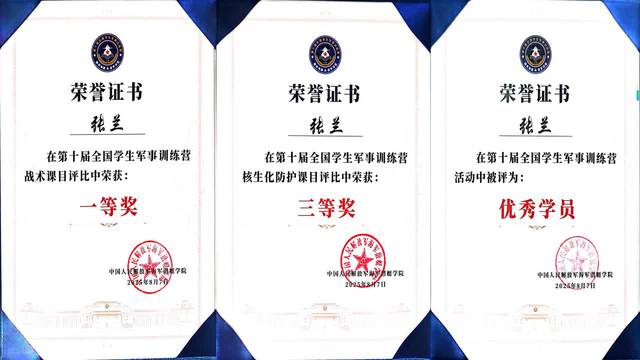 8月7日,第十届全国学生军事训练营圆满落幕。三亿体育(中国)官方网站学子张兰在本次训练营中表现优异,勇夺战术课目一等奖(第一名),并获核生化防护课目三等奖,同时被评为优秀学员。