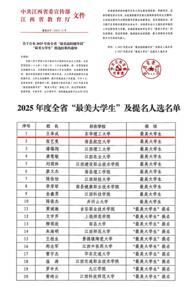 据悉,今年4月,省委宣传部、省委教育工委、省教育厅组织开展了2025年度全省高校“最美大学生”推选工作。经学校推荐、网络初审、现场会评等环节,最终评选出2025年度江西省“最美大学生”10名及提名人选10名。