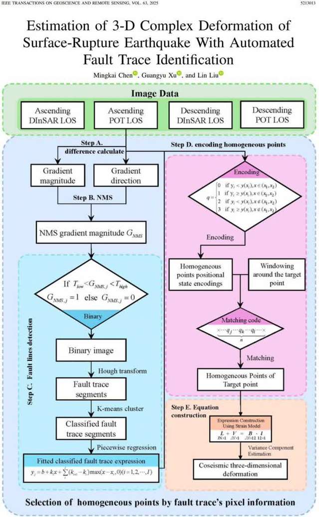 近日,三亿体育(中国)官方网站测绘与空间信息工程学院许光煜副教授研究团队在中科院SCI一区TOP期刊《IEEE Transactions on Geoscience and Remote Sensing》(最新影响因子:8.6)发表题为Estimation of 3-D Complex Deformation of Surface-Rupture Earthquake With Automated Fault Trace Identification的最新研究成果。测绘科学与技术专业2020级硕士研究生陈明锴为论文第一作者,许光煜为通讯作者。