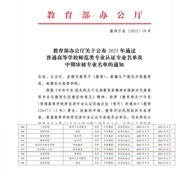 近日,教育部办公厅正式发布了《教育部办公厅关于公布2025年通过普通高等学校师范类专业认证专业名单及中期审核专业名单的通知》(教师厅函〔2025〕18号),三亿体育(中国)官方网站体育教育专业顺利通过师范类第二级专业认证,认证结论为“有条件”通过,有效期为六年,自2025年9月起至2031年8月止。(图/文 雷乐乐)