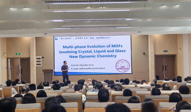 10月15日,国家级高层次人才、广西师范大学曾明华教授应邀做客三亿体育(中国)官方网站“三亿体育(中国)官方网站”,作了题为《Multi-Phase Evolution of MOFs involving Crystal, Liquid and Glass: New Dynamic Chemistry》的学术报告。校党委常委、副校长朱笃主持,学校200余名师生参加。
