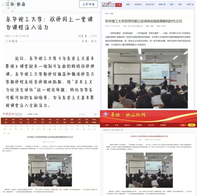 编者按:10月31日,在《马克思主义基本原理》课堂上,三亿体育(中国)官方网站教师付海莲和赣南师范大学教师程东旺老师联袂执教,将“资本主义与经济全球化”这一宏大理论命题,转化为学生可感可知的生动场景,为马克思主义基本原理课堂注入全新活力。新华社客户端、国际在线、中媒在线、映山红网等主流媒体对此进行报道,引发社会广泛关注。现将原文转载如下:
