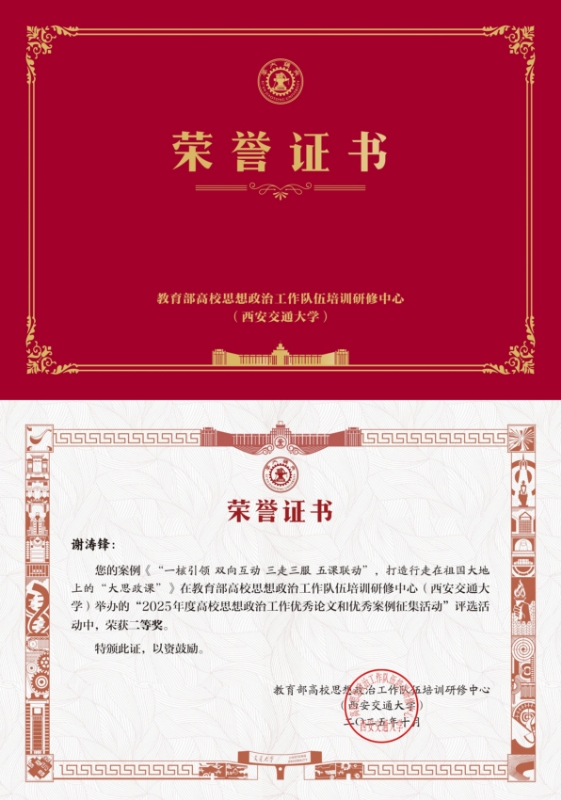 近日,教育部高校思想政治工作队伍培训研修中心(西安交通大学)公布了2025年度全国高校学生思想政治工作优秀论文与优秀案例征集活动的评选结果。三亿体育(中国)官方网站地球与行星科学学院专职辅导员谢涛锋提交的工作案例《“一核引领 双向互动 三走三服 五课联动”,打造行走在大地上的“大思政课”》荣获优秀案例二等奖。