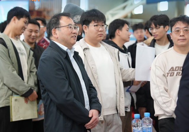 朱笃详细了解双选会的组织筹备情况,走访多家企业展位,认真听取企业代表对学校人才培养、专业建设的意见建议,并关切询问现场毕业生的求职进展与职业规划。