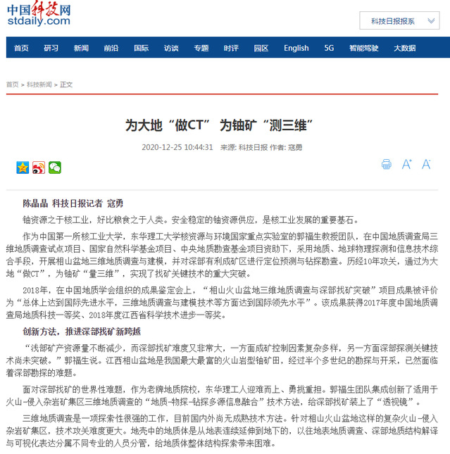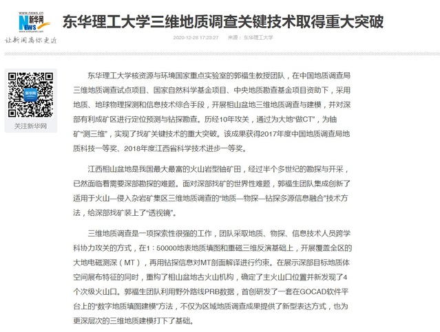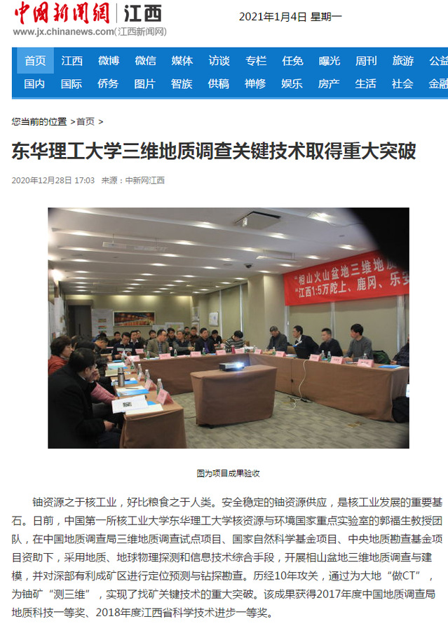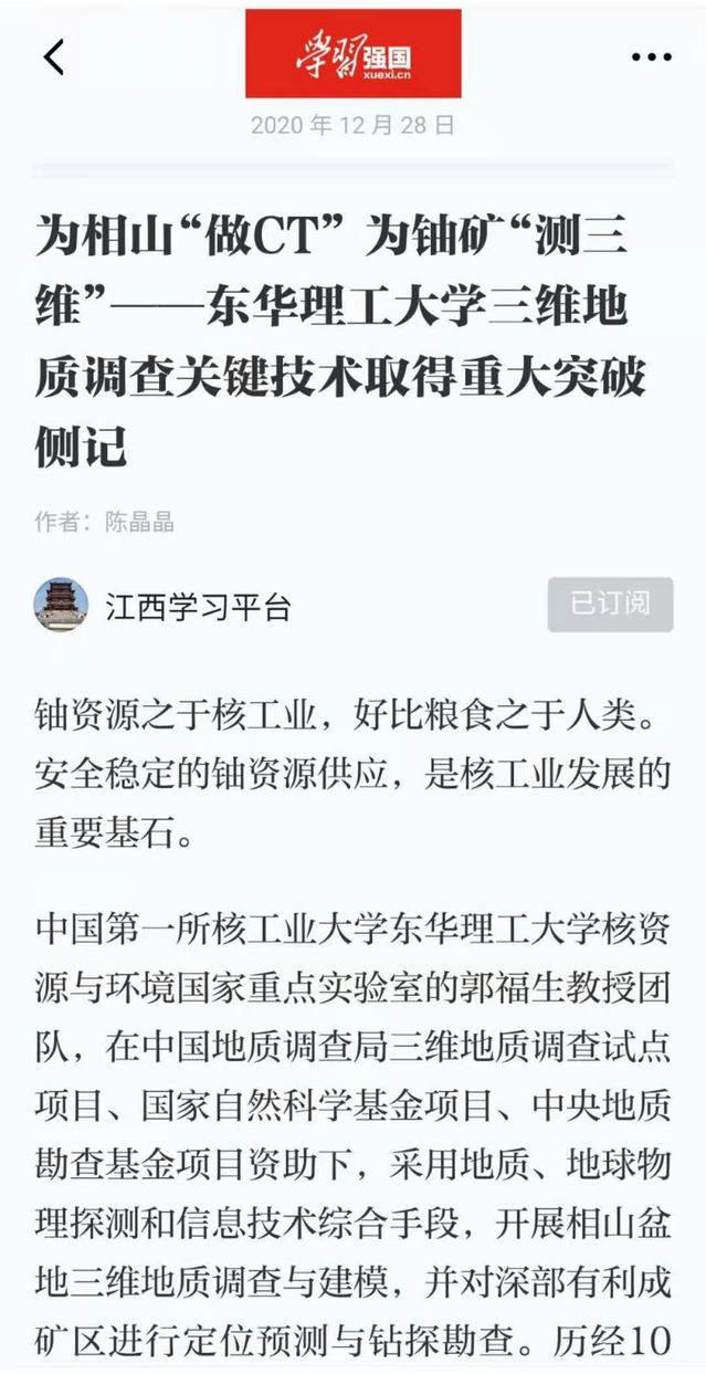 编者按:作为中国第一所核工业大学,我校核资源与环境国家重点实验室的郭福生教授团队,历经10年攻关,通过为大地“做CT”,为铀矿“测三维”,实现了找矿关键技术的重大突破。科技日报、学习强国、新华网、中国新闻网、中国科技网等主流媒体对此进行报道,引发社会广泛关注。现将全文转载如下:
