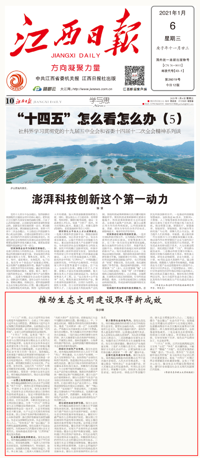编者按:1月6日,江西日报学与思版以《“十四五”怎么看怎么办》为题报道了社科界学习贯彻党的十九届五中全会和省委十四届十二次全会精神的系列谈。我校徐步朝副教授以“推动生态文明建设取得新成效”为题发表观点、看法,现将全文内容转载如下:
