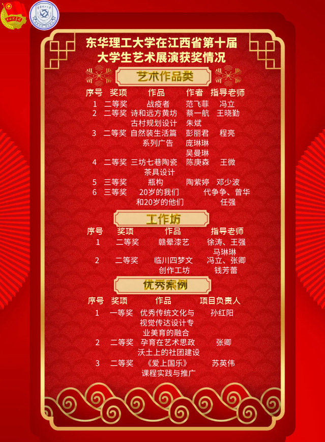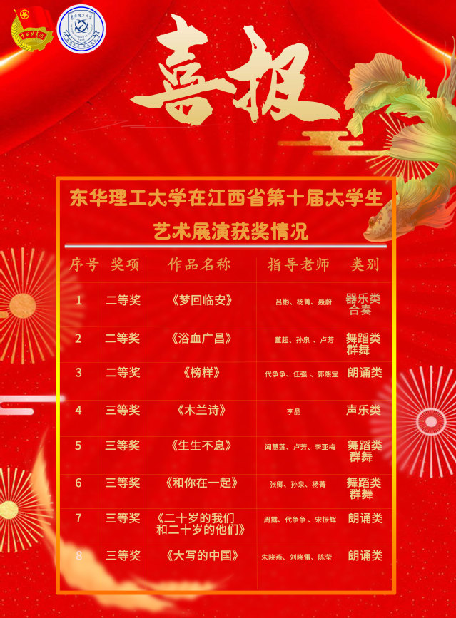 近日,江西省教育厅下发的《关于江西省第十届大学生艺术展演活动获奖情况的公示》中传来喜讯,在2020年9月至12月举行的江西省第十届大学生艺术展演活动中,我校艺术表演类和艺术作品类等项目共获奖19项。