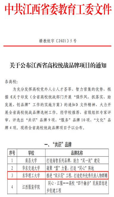 近日,在全省高校统战品牌选树工作中,由我校报送的《推进“双示范”工程,打造党外优秀代表人物群雕》被评为江西省高校统战“共识”品牌项目。