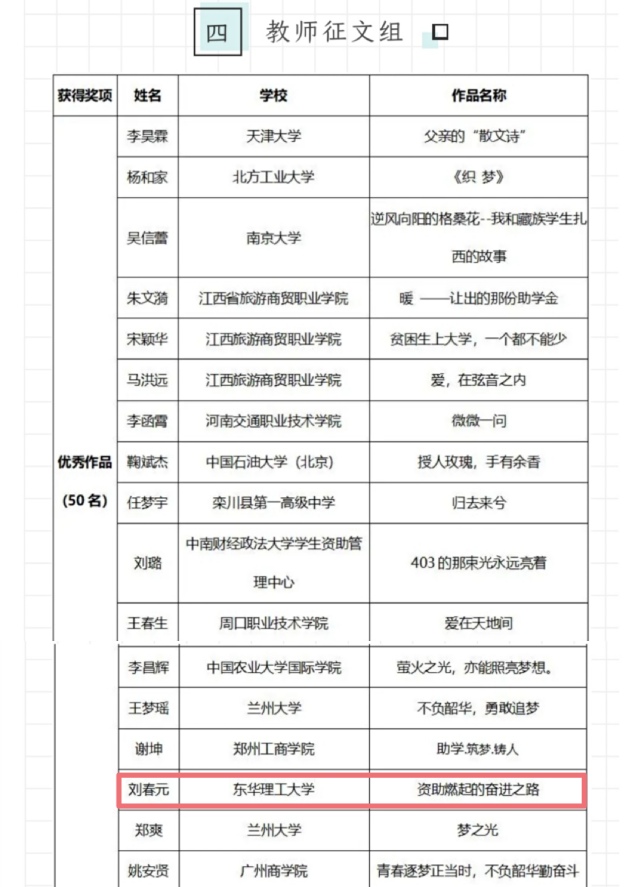 在教师征文组中,核科学与工程学院刘春元老师的作品《资助燃起的奋进之路》荣获优秀作品。