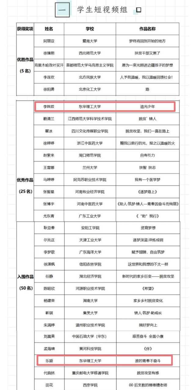 在学生短视频组中,艺术学院2020级本科生李姝姣的作品《追光少年》荣获优秀作品;测绘工程学院2019级研究生乐颖的作品《谁的青春不奋斗》荣获入围作品。