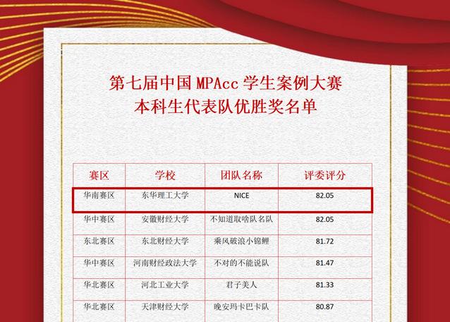 4月27日,由全国会计专业学位研究生教育指导委员会指导,中国MPAcc学生案例大赛组委会主办的中国MPAcc学生案例大赛获奖名单公示。我校经济与管理学院本科组队伍(NICE队)从全国550支队伍中脱颖而出,荣获初赛本科生前20强并获得本科生代表队优胜奖。