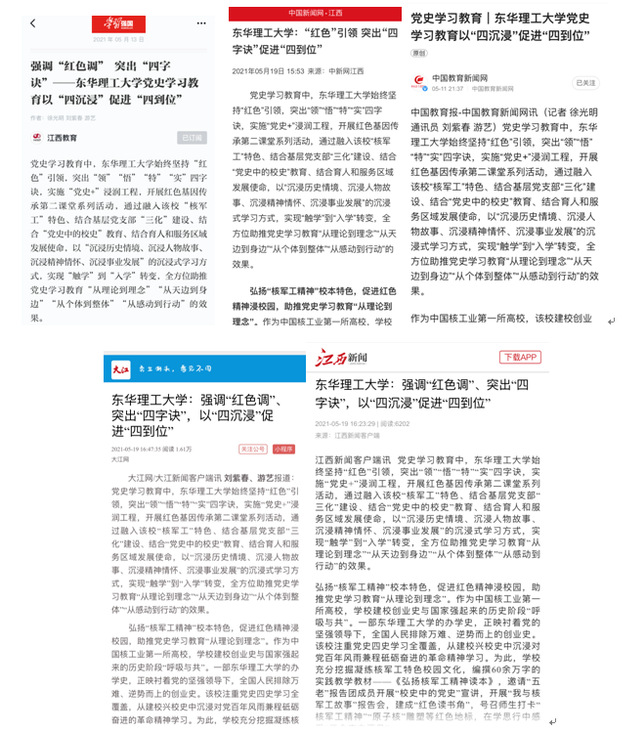 编者按:党史学习教育中,我校始终坚持“红色”引领,突出“领”“悟”“特”“实”四字诀,实施“党史+”浸润工程,开展红色基因传承第二课堂系列活动,以“沉浸历史情境、沉浸人物故事、沉浸精神情怀、沉浸事业发展”的沉浸式学习方式,实现“触学”到“入学”转变,全方位助推党史学习教育“从理论到理念”“从天边到身边”“从个体到整体”“从感动到行动”的效果。人民网、党史学习教育官网、学习强国、中国新闻网、中国教育新闻网、大江网、江西新闻客户端对此进行报道,现将相关内容转载如下: