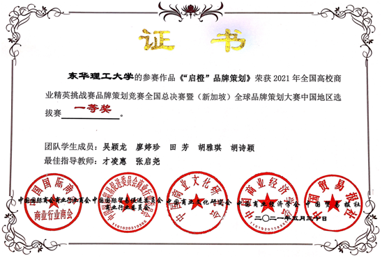 本次比赛共有来自全国110所高校的299个团队参赛,我校共4个团队参赛。最终,由才凌惠和张启尧两位老师指导的胡诗颖、吴颖龙等同学的作品《启橙品牌策划》斩获全国一等奖。由赵建彬、冯益、陶建蓉等老师指导的胡国万、刘嘉丽、邓俊龙等同学的作品《质本品牌策划案》《唐山兴安品牌策划方案》和《季季红火锅品牌策划案》均荣获全国三等奖。此外,我校还荣获最佳院校组织奖。