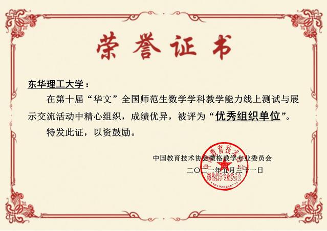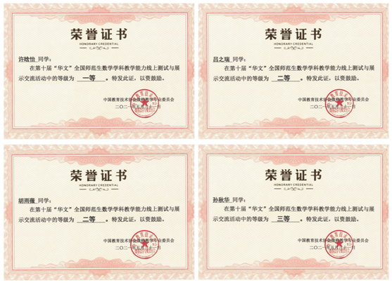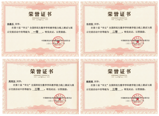 我校在2021年第十届“华文”全国师范生数学学科教学能力线上测试与展示交流活动中荣获佳绩