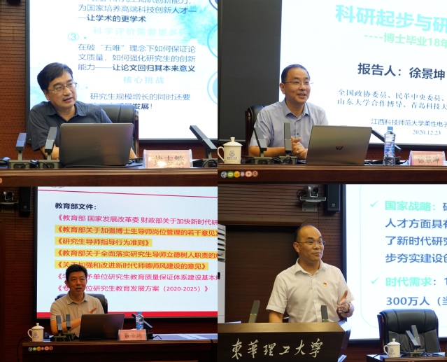 本次培训会共有四个专题报告,南昌大学黄志繁教授作了“研究生教育的新形势和导师的新要求”专题报告,分析了学位与研究生教育改革的新趋势,提出了学位与研究生教育改革的新要求和新理念,如要创新三亿 SPORTS模式,优化生源招生质量,完善导师奖惩机制等;江西师范大学董圣鸿教授作了“加强师德师风教育,落实立德树人根本任务”的专题报告,分析了国家和省里关于立德树人相关文件精神和要求,指出导师要具备四**宝,即学习师德理论、更新育人思想、培养道德情操、提高专业能力;江西财经大学罗世华教授作了“研究生创新的前提与基石---学术规范与科研诚信”的专题报告,从导师“如何领会学术规范和科研诚信文件精神”“如何避免学术不端问题”“如何打造科研伦理观念”“如何提升道德修养水平”等方面谈了自己的独到见解并提出了相应对策措施;江西科技师范大学徐景坤教授作了“科研起步与研究生培养”的专题报告,从“科研工作”“研究生培养”“行政管理”“团队发展”“个人心得”等多个视角出发,分享了他十八年来指导研究生的经验。