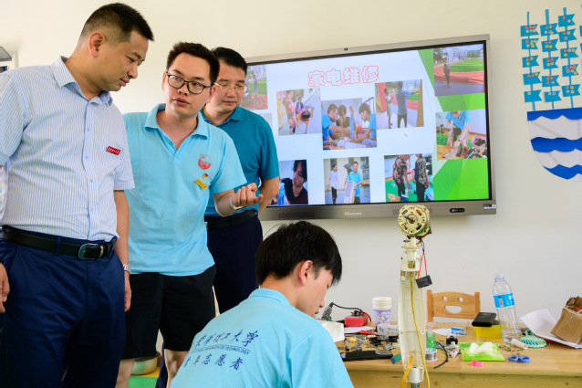在资溪县马头山镇,刘云海一行在资溪县委常委、副书记饶源中的陪同下,来到校团委赴资溪志愿服务队的社会实践点,详细询问大学生爱心支教“彩虹课堂”日常授课情况,认真观摩手工课、音乐课等特色课程现场教学。在免费家电维修服务站,刘云海一行详细询问了解家电维修工作开展情况,并为同学们发挥专业特长,学以致用、服务百姓的行为点赞。