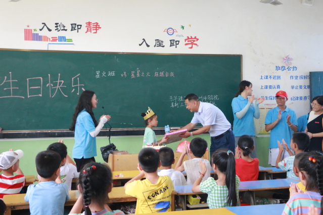 南城县黄冈春华学校,刘云海一行走进抚州师范学院志愿者们开设的支教课堂,观摩舞蹈教学《你笑起来真好看》、红歌教唱《唱支山歌给党听》,并参加大学生志愿者为小朋友举办的特殊生日会。在手绘墙画前,刘云海认真听取志愿者们对手绘墙的内容和内涵的介绍,并与大学生志愿者和小朋友们一起在手绘墙上按下手印,大手拉小手,共同努力,奋发向上。