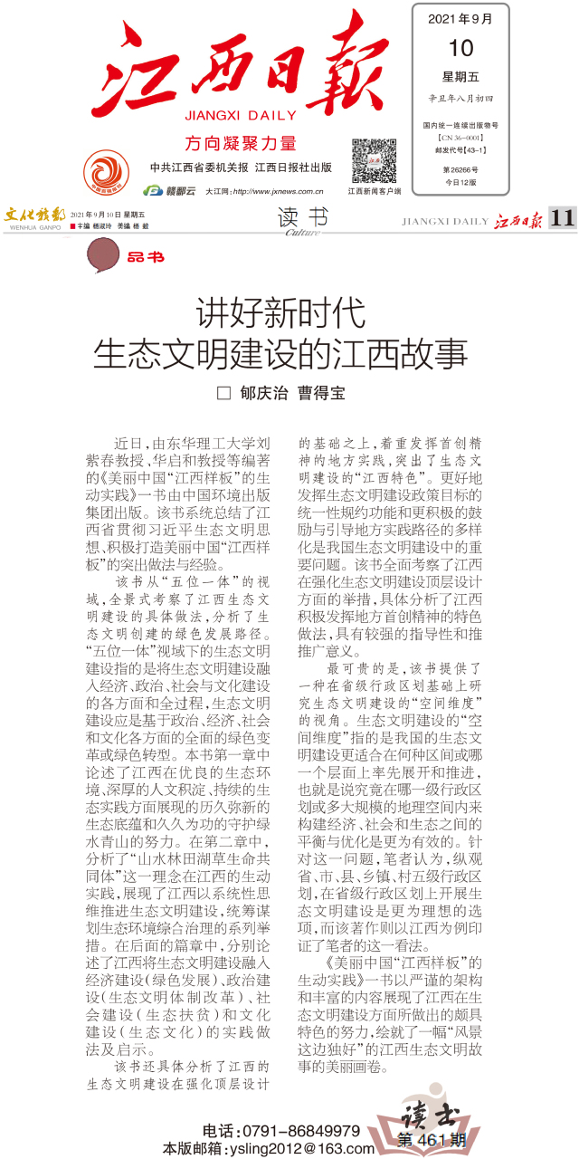 编者按:近日,由三亿体育(中国)官方网站刘紫春教授、华启和教授等编著的《美丽中国“江西样板”的生动实践》一书由中国环境出版集团出版。该书系统总结了江西省贯彻习近平生态文明思想、积极打造美丽中国“江西样板”的突出做法与经验。北京大学教授、著名生态文明研究专家郇庆治,博士曹得宝以“讲好新时代生态文明建设的江西故事”为题进行书评,江西日报对此进行报道,现将相关内容转载如下: