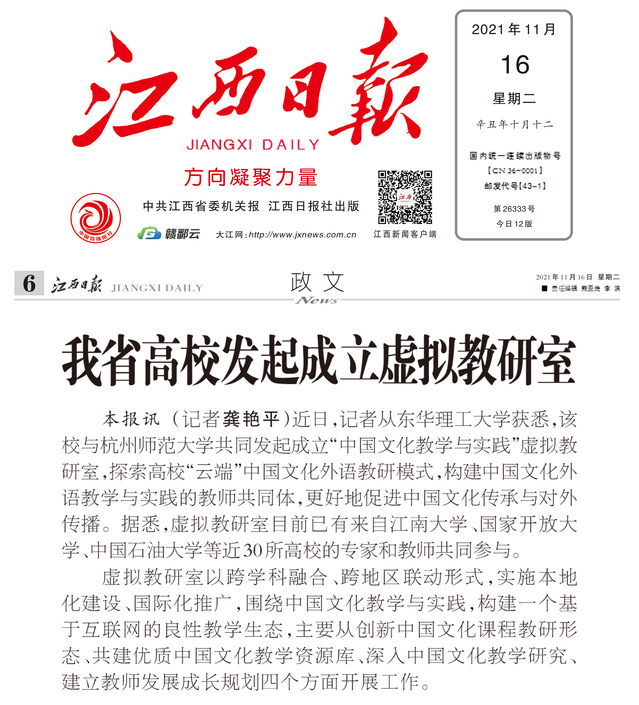 编者按:近日,我校与杭州师范大学共同发起成立“中国文化教学与实践”虚拟教研室,探索高校“云端”中国文化外语教研模式,构建中国文化外语教学与实践的教师共同体,更好地促进中国文化传承与对外传播。江西日报对此进行报道,现将原文转载如下: