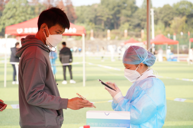 核酸检测点均按照标准化要求,设置了等候区、信息登记区、采集区、缓冲区和临时隔离区等场地。医务人员身着防护服,反复进行试管贴签、消毒洗手、采集咽拭子、现场采样装管等规范操作,耐心引导受检师生按照核酸检测要求配合完成每项流程。师生们戴好口罩,分时段、分批次前往采样点,有序排队等候,配合完成测温、扫码、登记、采样等相关流程。