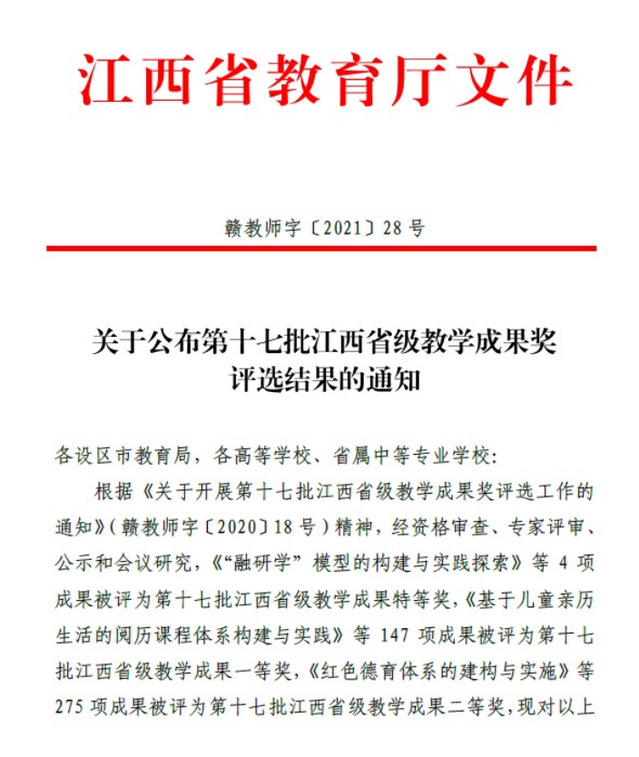 近日,江西省教育厅发布《关于公布第十七批江西省级教学成果奖评选结果的通知》(赣教师字〔2021〕28号),我校共有7项成果荣获第十七批江西省级研究生层次教学成果奖,其中,一等奖4项、二等奖3项。