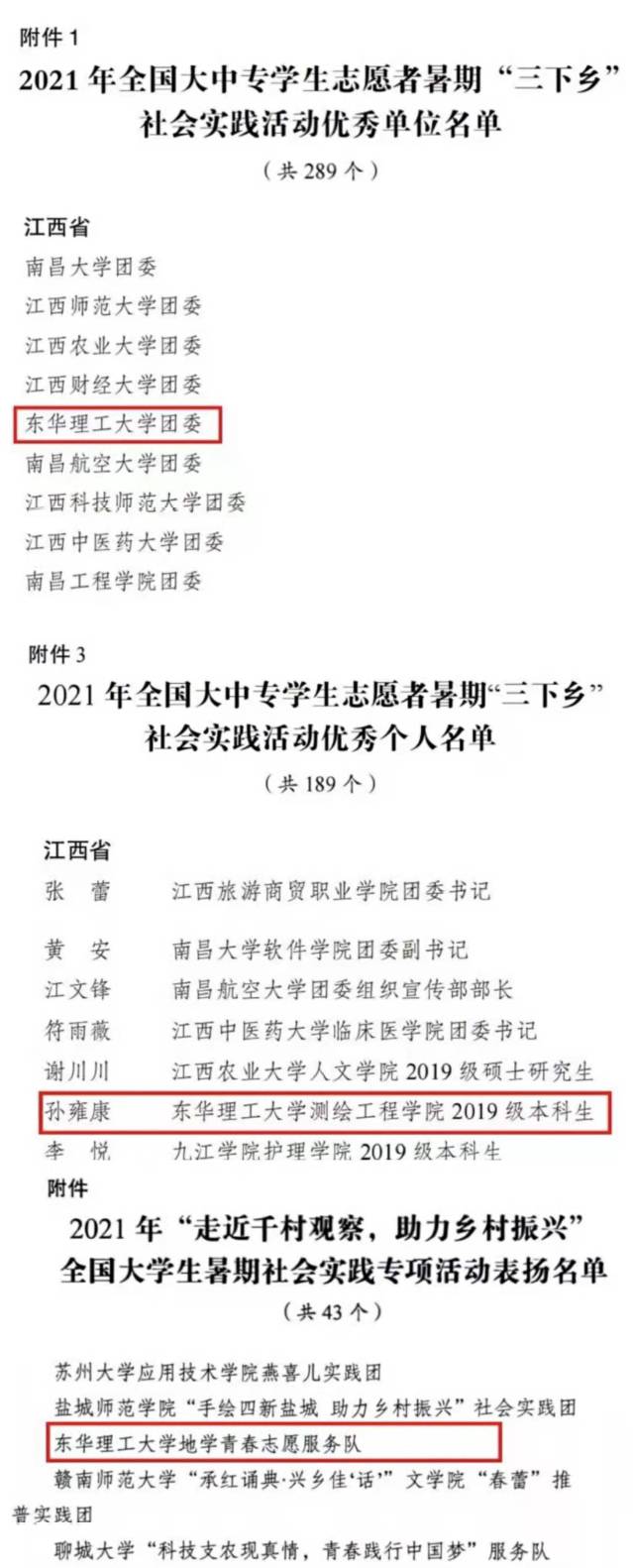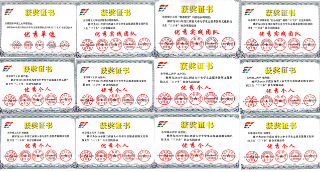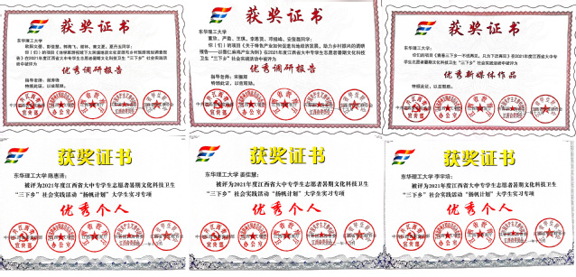 在团省委发布的《关于2021年江西省大中专学生志愿者暑期“三下乡”社会实践活动的通报》(赣青联发[2021]39号)中,我校有3支队伍被评为优秀实践团队,8人被评为优秀个人,2篇调研报告被评选为优秀调研报告,1部新媒体作品被评选为优秀新媒体作品,3人荣获“扬帆计划”大学生实习专项优秀个人荣誉。