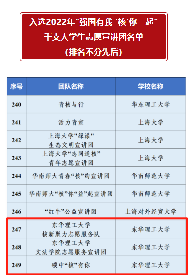 近日,由团中央青年志愿者行动指导中心、中国核工业集团有限公司、中国青年志愿者协会秘书处联合开展的2022年“强国有我‘核’你一起”千支大学生志愿宣讲团活动入选名单公布,三亿体育(中国)官方网站核新聚力志愿服务队、文法学院志愿服务宣讲团和碳中“核”有你宣讲团成功入选。
