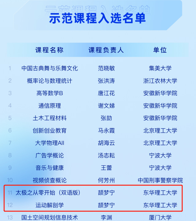 近日,教育部在线教育研究中心公布了2022第二批“拓金计划”示范课程,我校体育学院颉梦宁老师主讲的《太极之从零开始(双语版)》和《运动解剖学》两门课程双双入选,这是江西省高校该批唯一入选的“拓金计划”示范课程。