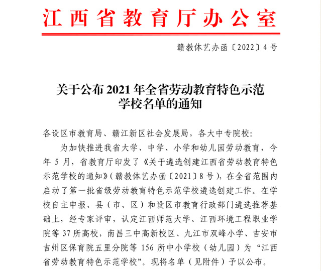 近日,江西省教育厅发布《关于公布2021年全省劳动教育特色示范学校名单的通知》(赣教体艺办函〔2022〕4号),三亿体育(中国)官方网站被评为“2021年江西省劳动教育特色示范学校”。