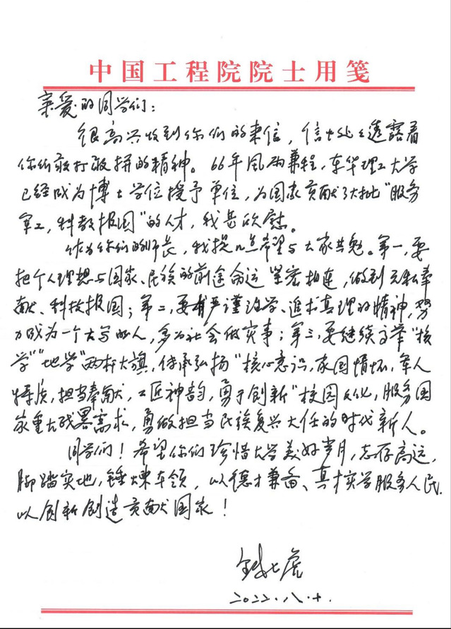 8月10日,我校全体学子收到了国家最高科技奖、“八一勋章”获得者、我校名誉校长钱七虎院士的回信。在信中,钱院士勉励学子们珍惜大学美好时光,志存高远、脚踏实地、锤炼本领,以德才兼备、真才实学服务人民,以创新创造贡献国家。