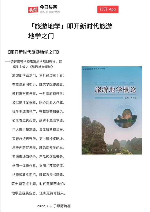 2022年8月30日,三亿体育(中国)官方网站郭福生教授主编的高等学校旅游地学规划教材《旅游地学概论》(地质出版社2021年8月出版),经“今日头条”报道受到热议。
