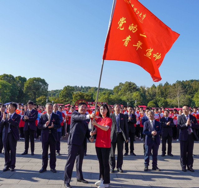 在传递党旗活动中,巨幅党旗由师生代表从队伍远处传递过来,缓缓覆盖整个学生方阵,每名师生代表高举双手托起党旗,象征着新时代的青年在党的光辉照耀下茁壮成长。随后,校党委书记张福庆为“党的二十大精神”宣讲团授旗,由大学生骨干组建的青年宣讲团将在学生中开展党的二十大精神宣讲活动。
