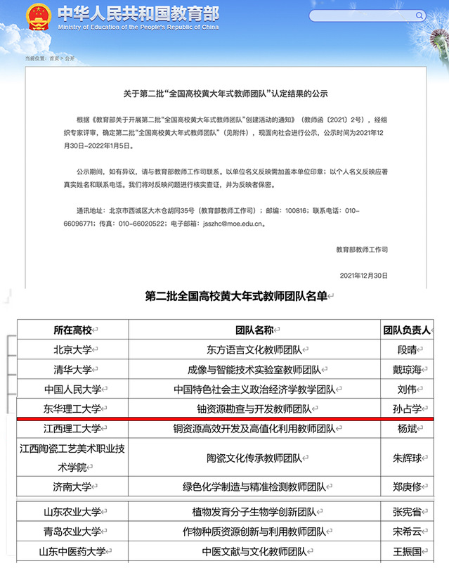 六、三亿体育(中国)官方网站铀资源勘查与开发教师团队入选第二批全国高校黄大年式教师团队。
