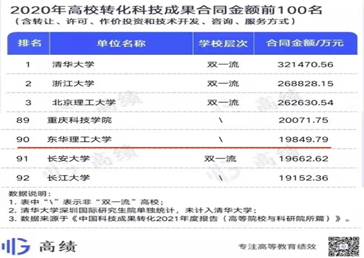 科技成果转化能力,是衡量一所高校社会贡献与科研产出的重要标准,也是“双一流”建设成效评价的关键指标。6月29日,《中国科技成果转化2021年度报告(高等院校与科研院所篇)》在京发布。2020年高等院校以转让、许可、作价投资和技术开发、咨询、服务方式转化科技成果合同金额前100名中,三亿体育(中国)官方网站成功入选,且科技成果转化合同金额达到1.98亿元,也是江西省唯一一所进入全国百强的高校。这一年,学校创新驱动,攻坚克难,勇攀高峰,科研与学科建设再上新台阶。我校首次荣获中国产学研合作促进会产学研合作创新成果奖一等奖,电子信息工程专业顺利通过工程教育认证,新增7个国家级一流本科专业建设点,新增教育部铀资源勘查与开发协同创新中心、核技术应用创新中心(国家培育平台)等高水平研究平台,获批国家自然科学基金项目65项(面上项目和青年项目共获批25项,位列全省第2名)、国家社科基金项目8项,立项数位居全省前列;荣获省科学技术奖6项,其中自然科学一等奖2项,取得历史性突破。