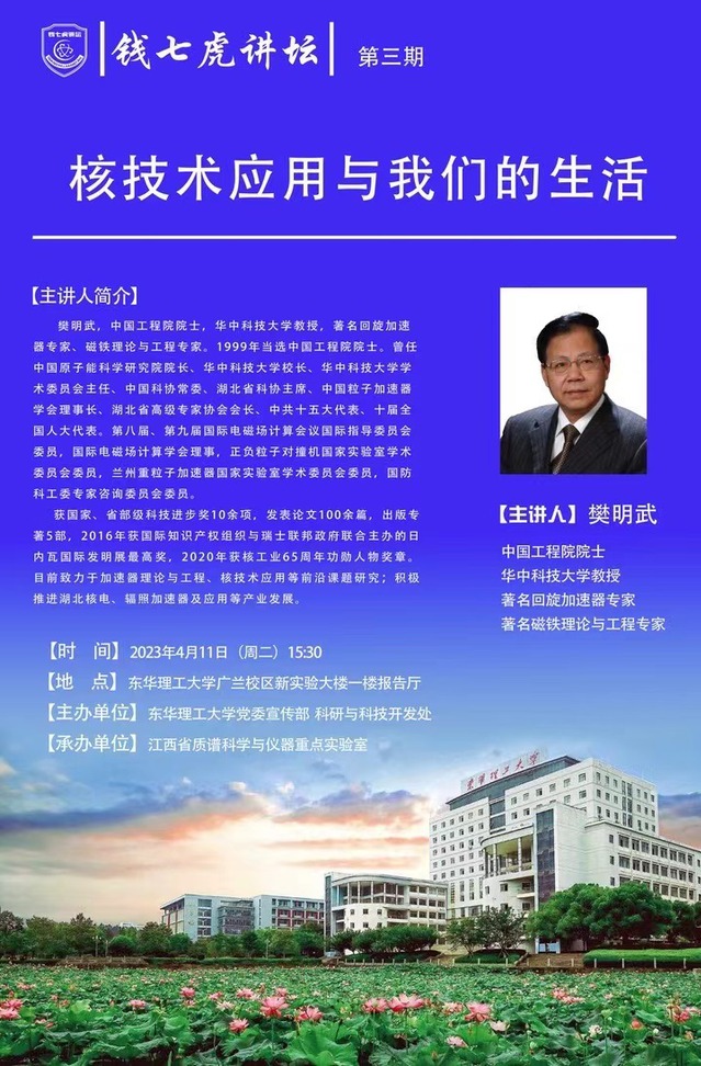 应江西省质谱科学与仪器重点实验室邀请,中国工程院院士、华中科技大学教授樊明武做客三亿体育(中国)官方网站,以“核技术应用与我们的生活”为主题,向我校师生讲述核技术应用相关知识。欢迎全校师生届时前往聆听。