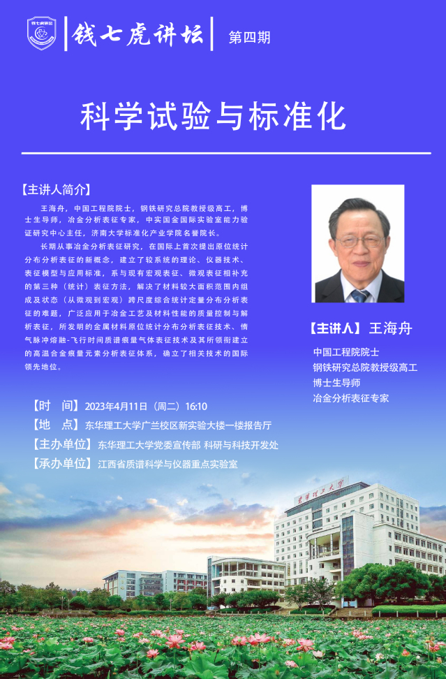 应江西省质谱科学与仪器重点实验室邀请,中国工程院院士、钢铁研究总院教授级高工、博士生导师、冶金分析表征专家王海舟做客三亿体育(中国)官方网站,以“科学试验与标准化”为主题,向我校师生讲述科学试验相关知识。欢迎全校师生届时前往聆听。
