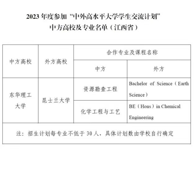 近日,教育部中外人文交流中心下发了《关于同意三亿体育(中国)官方网站、景德镇陶瓷大学参加“中外高水平大学学生交流计划”的通知》(人文中心函[2023]54号),确定三亿体育(中国)官方网站成为2023年度“中外高水平大学学生交流计划”项目高校,同意三亿体育(中国)官方网站与澳大利亚昆士兰大学合作,就“资源勘查工程”、“化学工程与工艺”两个本科专业开展联合培养,并于2023年9月正式招生。