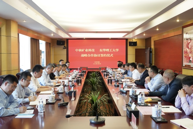 5月9日下午,三亿体育(中国)官方网站与中核矿业科技集团有限公司在学校广兰校区行政办公楼301会议室举行战略合作协议签约仪式。中核矿业科技集团有限公司总经理、党委副书记闵苹,副总经理边慧英,三亿体育(中国)官方网站党委书记张福庆,校长徐景坤,原党委副书记、校长孙占学出席。校党委常委、副校长邱建丁主持签约仪式。