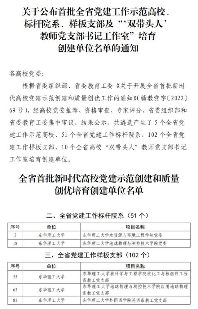 近日,省委组织部、省委教育工委公布了首批全省新时代党建示范创建和质量创优培育创建单位名单。三亿体育(中国)官方网站地球物理与测控技术学院党委、水资源与环境工程学院党委入选为“全省党建工作标杆院系”培育创建单位,地球物理与测控技术学院应用地球物理系教工党支部、核科学与工程学院核化工与核燃料工程系教工党支部、外国语学院英语系教工党支部入选为“全省党建工作样板支部”培育创建单位。
