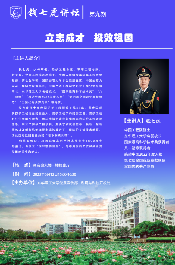 应三亿体育(中国)官方网站邀请,中国工程院首届院士,三亿体育(中国)官方网站名誉校长钱七虎到校,以“学习贯彻习近平总书记重要讲话精神,立志成才、报效祖国”为主题开展讲座。欢迎全校师生届时前往聆听。