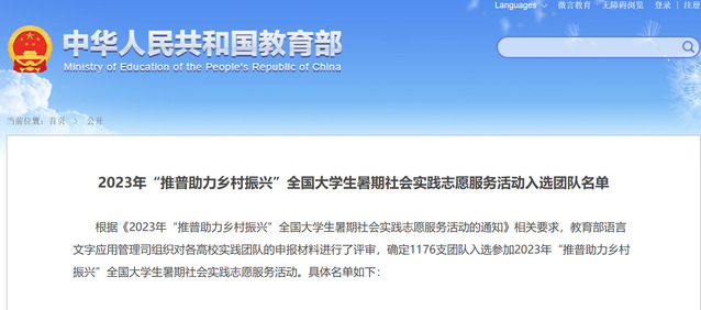 据悉,自活动主题发布以来,各学院实践队积极筹备项目,准备材料。经过校内初选和教育部终审,最终3支团队入选参加2023年“推普助力乡村振兴”全国大学生暑期社会实践志愿服务活动。