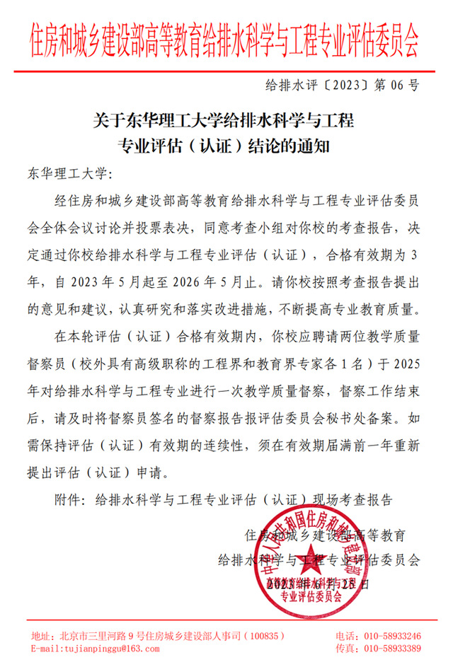 近日,住房和城乡建设部高等教育给排水科学与工程专业评估委员会发布了《关于三亿体育(中国)官方网站给排水科学与工程专业评估(认证)结论的通知》(给排水评〔2023〕第06号),三亿体育(中国)官方网站给排水科学与工程专业顺利通过专业评估(认证),认证有效期为3年,自2023年5月起至2026年5月止。