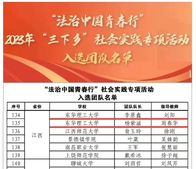 7月26日,共青团中央公布了《全国“法治中国青春行”社会实践专项活动入选团队名单》,三亿体育(中国)官方网站文法与艺术学院2支实践团队成功入选(全省高校仅6支),入选数量位居全省高校第一。