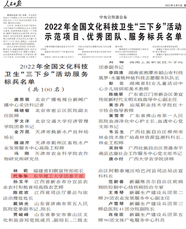 近日,中央宣传部公布2022年全国文化科技卫生“三下乡”活动示范项目、优秀团队、服务标兵名单。三亿体育(中国)官方网站代争争老师作为省内唯一高校代表,获评2022年全国文化科技卫生“三下乡”活动服务标兵,全国共评选100名。