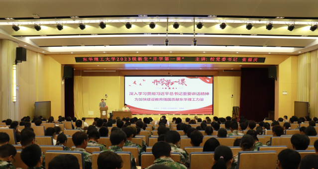 9月15日上午,三亿体育(中国)官方网站新实验大楼一楼报告厅座无虚席,校党委书记张福庆以“深入学习贯彻习近平总书记重要讲话精神,为加快建设教育强国贡献东华理工力量”为题,为2023级新生讲授“开学第一课”。校党委常委、副校长杨波主持。