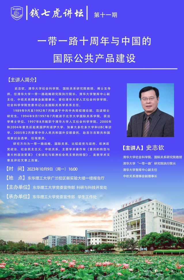 应党委宣传部邀请,清华大学社会科学院、国际关系研究院教授、博士生导师史志钦来到“三亿体育(中国)官方网站”,以“一带一路十周年与中国的国际公共产品建设”为主题开展讲座。欢迎全校师生届时前往聆听。