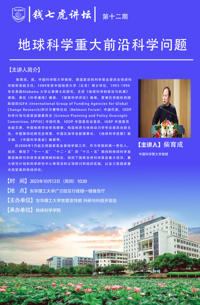应党委宣传部邀请,中国科学院大学教授,原国家自然科学基金委员会地球科学部常务副主任柴育成来到“三亿体育(中国)官方网站”,以“地球科学重大前沿科学问题”为主题开展讲座。欢迎全校师生届时前往聆听。