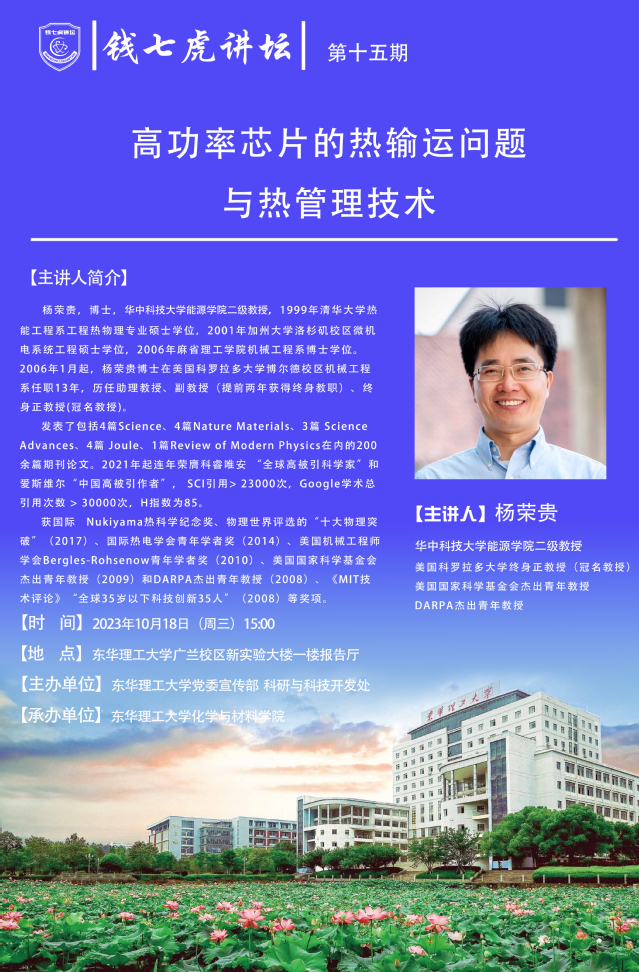 应党委宣传部邀请,华中科技大学能源学院二级教授杨荣贵来到“三亿体育(中国)官方网站”,以“高功率芯片的热输运问题与热管理技术”为主题开展讲座。欢迎全校师生届时前往聆听。